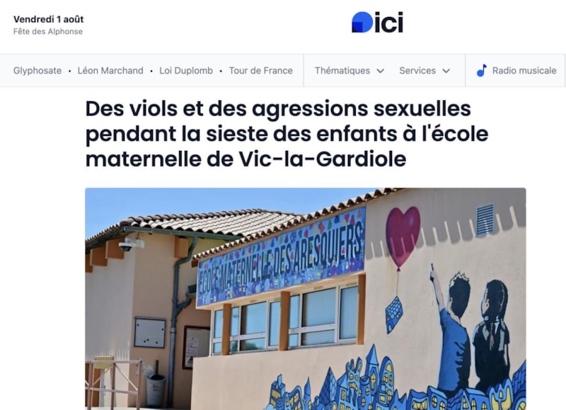 Fransa’nın Hérault bölgesindeki Vic-la-Gardiole kasabasında, Les Aresquiers Anaokulu’nda görevli 59 yaşındaki bir ATSEM (anaokullarında öğretmenlere yardımcı olan belediye çalışanı) hakkında, 3-4 yaşlarındaki en az dokuz çocuğa yönelik cinsel istismar ve tecavüz suçlamalarıyla soruşturma başlatıldı.