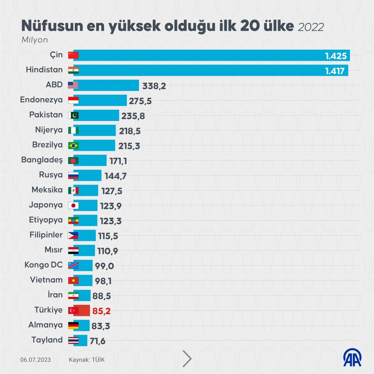 Türkiye İstatistik Kurumu (TÜİK) verilerine göre, Türkiye, 85 milyon 279 bin 553 kişilik nüfusuyla 194 ülke arasında 18'inci sırada yer aldı.