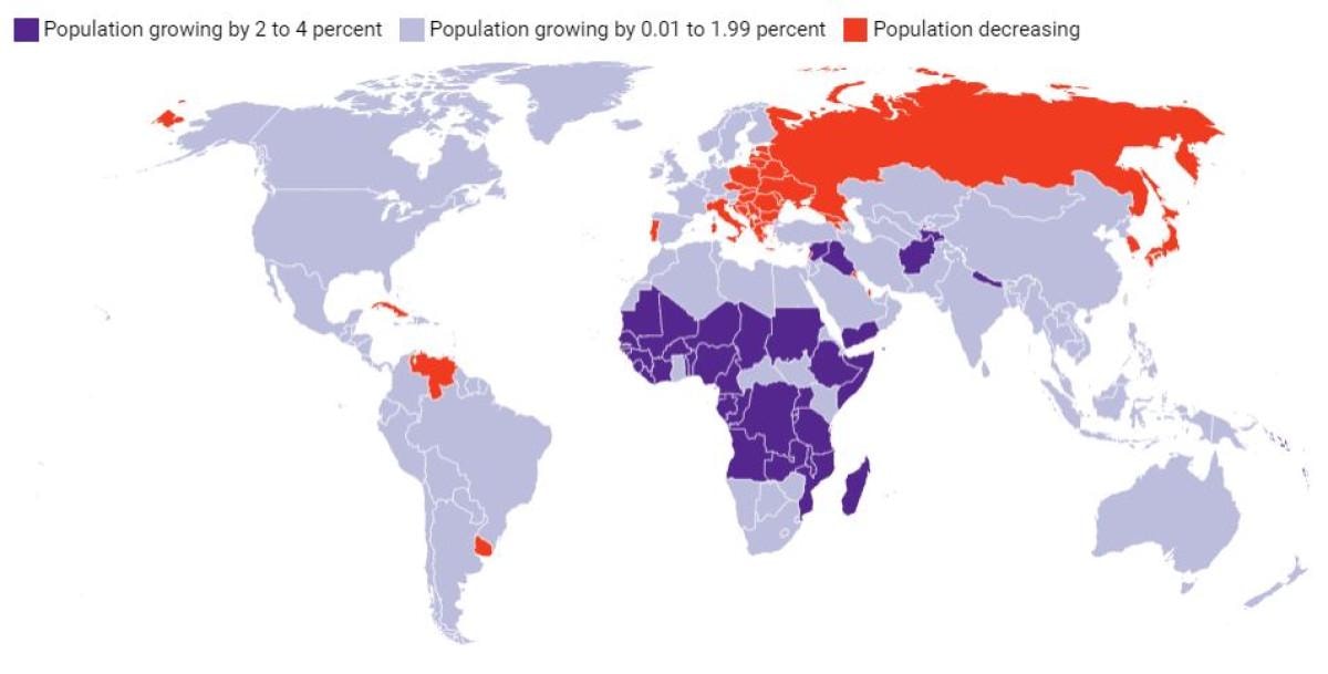 Ülkelere göre nüfusların artış ya da azalış eğiliminde olduklarına ilişkin haritaya göre Türkiye'nin nüfusu artmaya devam ediyor. Ülkemiz için nüfus artış hızı oranı yüzde 0,75 olarak kayıtlara geçti.