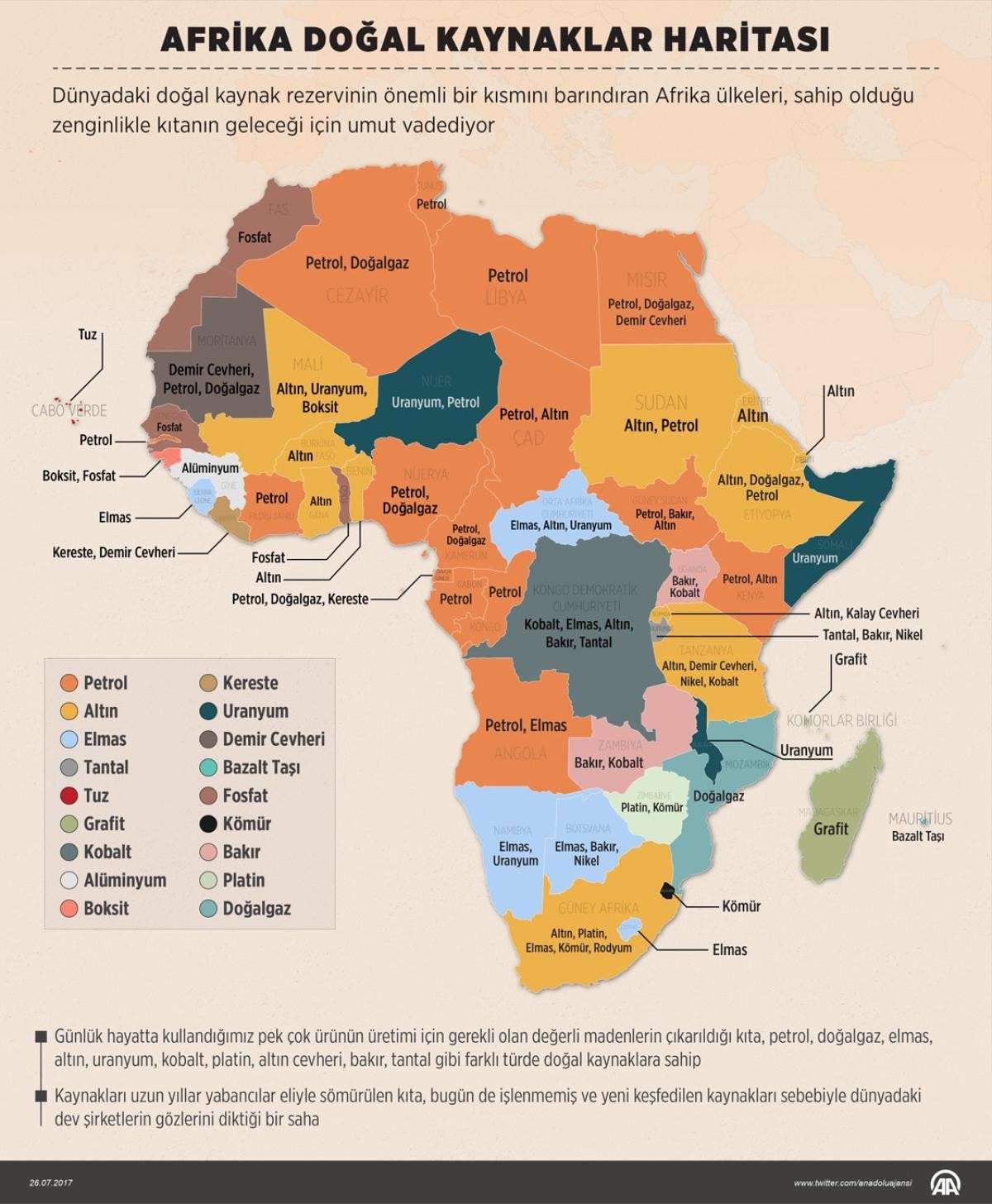 Bunlar; petrol, doğalgaz, elmas, altın, uranyum, kobalt, platin, altın cevheri, bakır, tantal gibi farklı doğal kaynaklar.