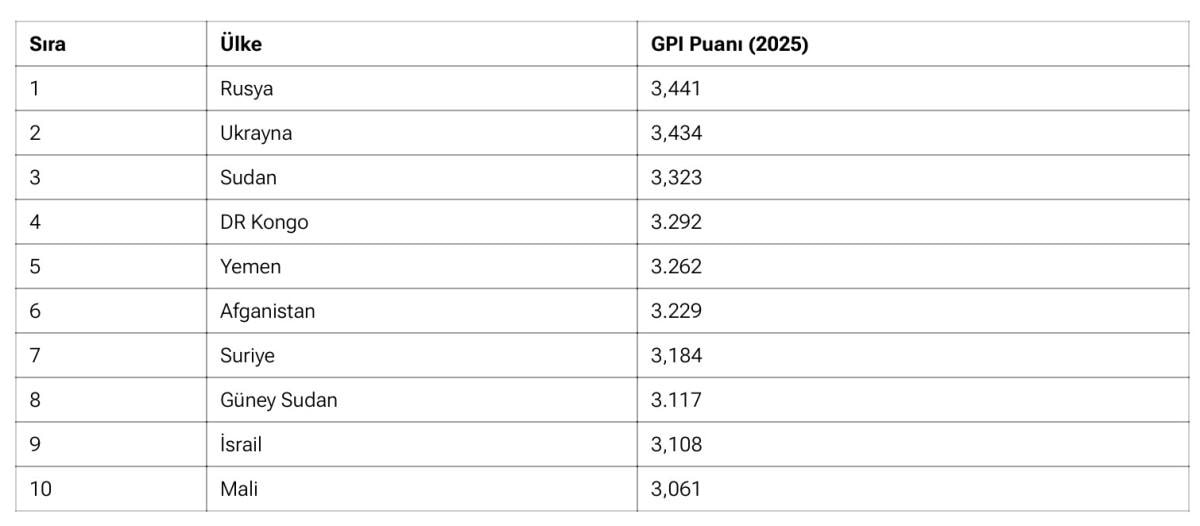 Ekonomi ve Barış Enstitüsü tarafından yayınlanan 2025 Küresel Barış Endeksi'ne göre dünyanın en tehlikeli ülkeleri belli oldu.