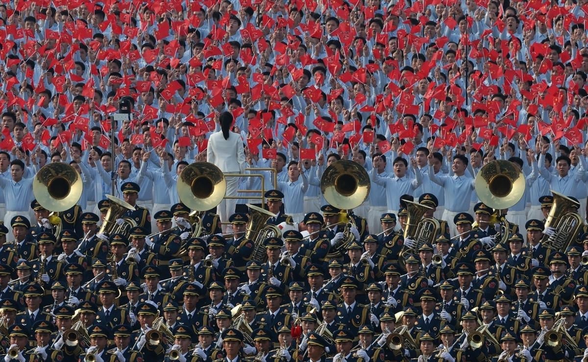 Çin Devlet Başkanı Şi Cinping, İmparatorluk Sarayı'nın Tienanmın Kapısı'nın balkonunda halka hitap etmesinin ardından tören aracına binerek Çang'an Bulvarı üzerinde konuşlanan birlikleri teftiş etti.