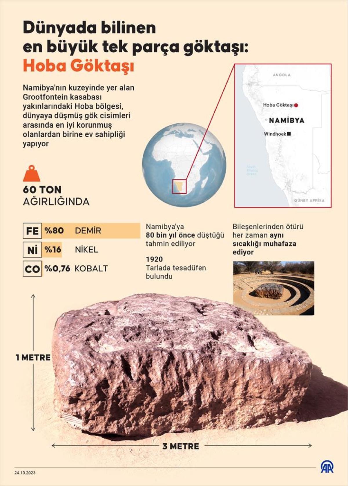 Hoba Göktaşı Miras Alanı rehberlerinden Namibyalı Jonathan, yeryüzündeki bilinen en büyük tek parça göktaşı ünvanına sahip Hoba Göktaşı'nın 80 bin yıl önce dünyaya düştüğünün tahmin edildiğini söyledi.