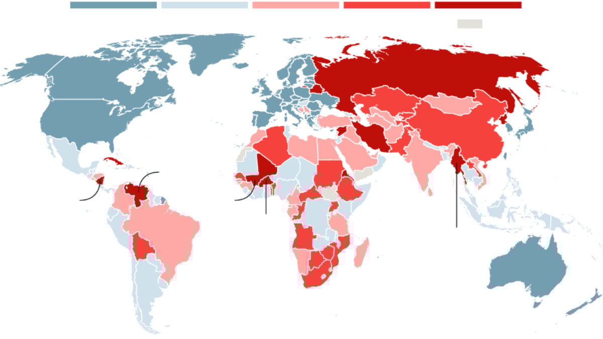 Haritada kırmızı renk, Rusya'ya eğilimi ve bu ülkeye desteği temsil ederken, mavi taraf ise Batı yanlısı olanları ve Rusya'yı kınayanları gösteriyor.