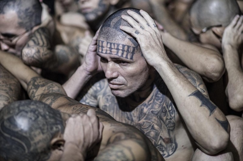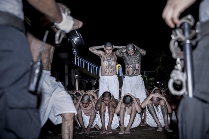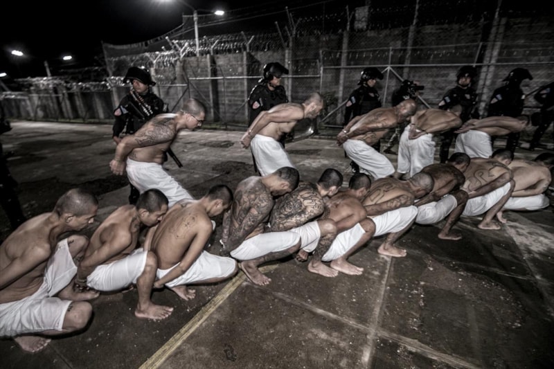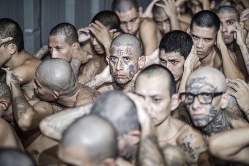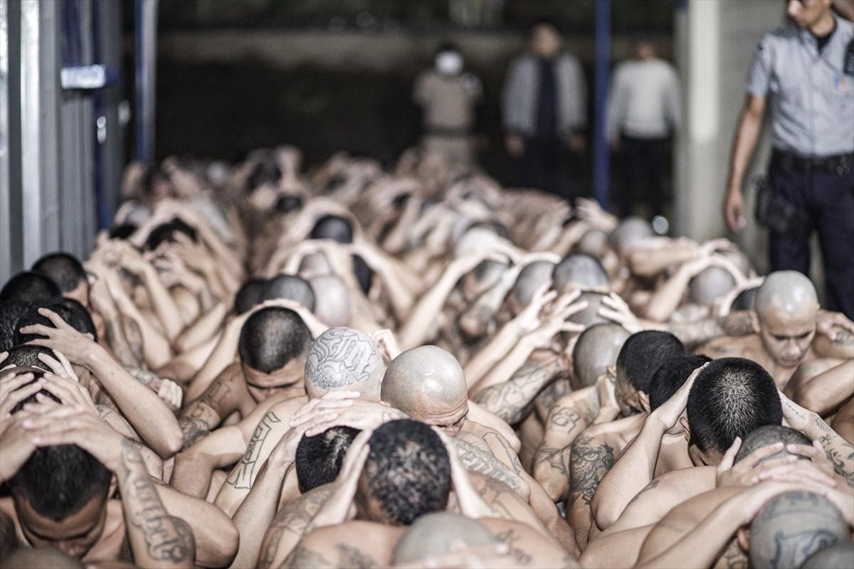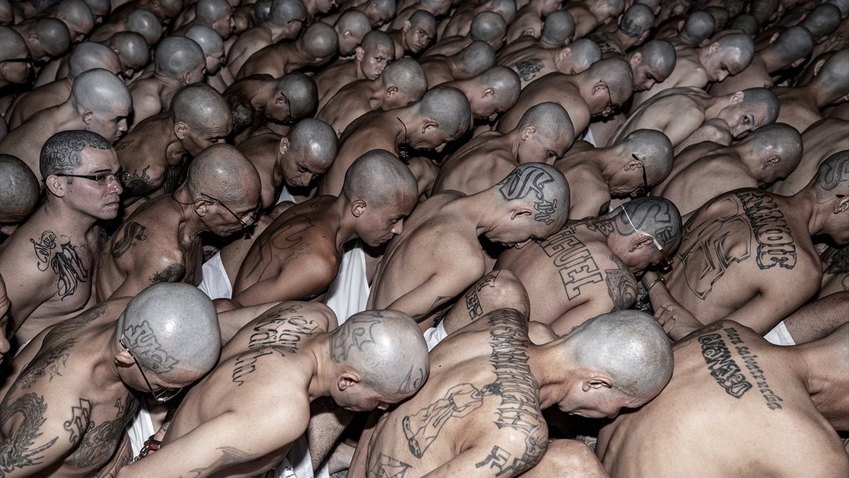 Paylaşılan görüntülerde, saçları kazınmış, dövmeli ve beyaz şortlu çete üyelerinin elleri arkadan kelepçeli şekilde dev hapishaneye götürüldüğü anlar yer aldı.