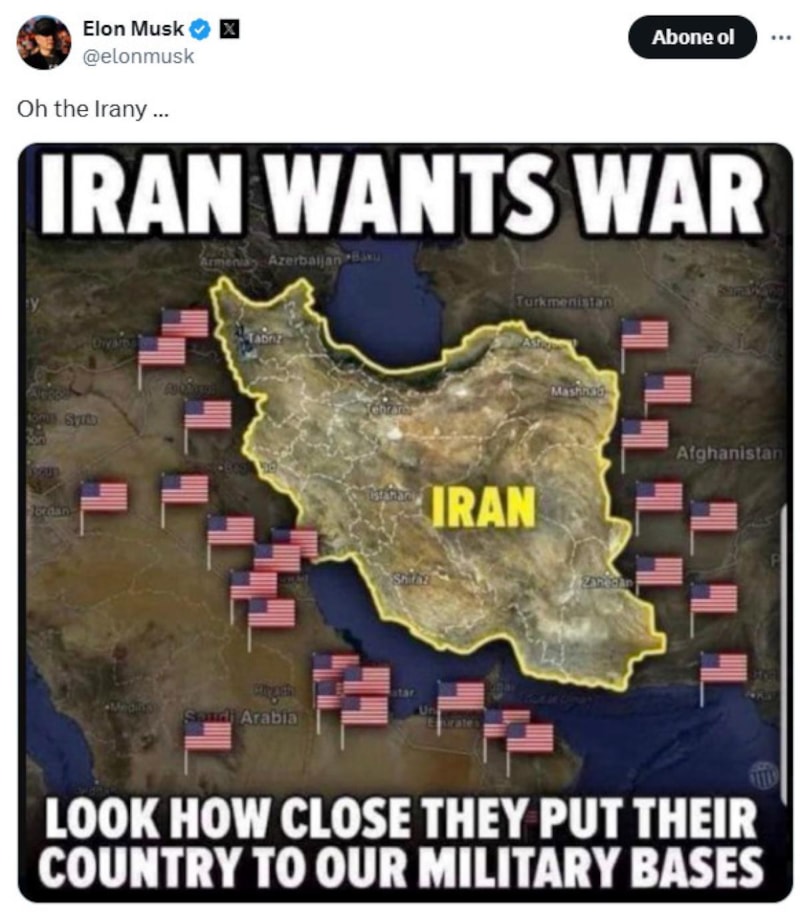Öte yandan Musk, geçtiğimiz yıl içinde sosyal medya hesabından İran ile ilgili ironik bir paylaşım yapmış, "İran, savaş istiyor. Bakın, onlar ülkelerini bizim askeri üslerimizin ne kadar yakınına kurmuşlar." demişti.