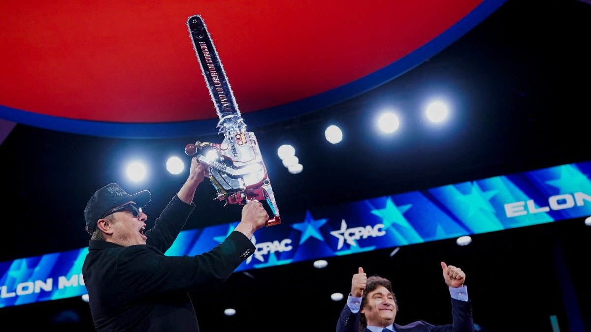 Musk, testereyi kaldırarak "Bu testere bürokrasi için" ifadesini kullandı. Musk'ın testereli şovu büyük alkış topladı.