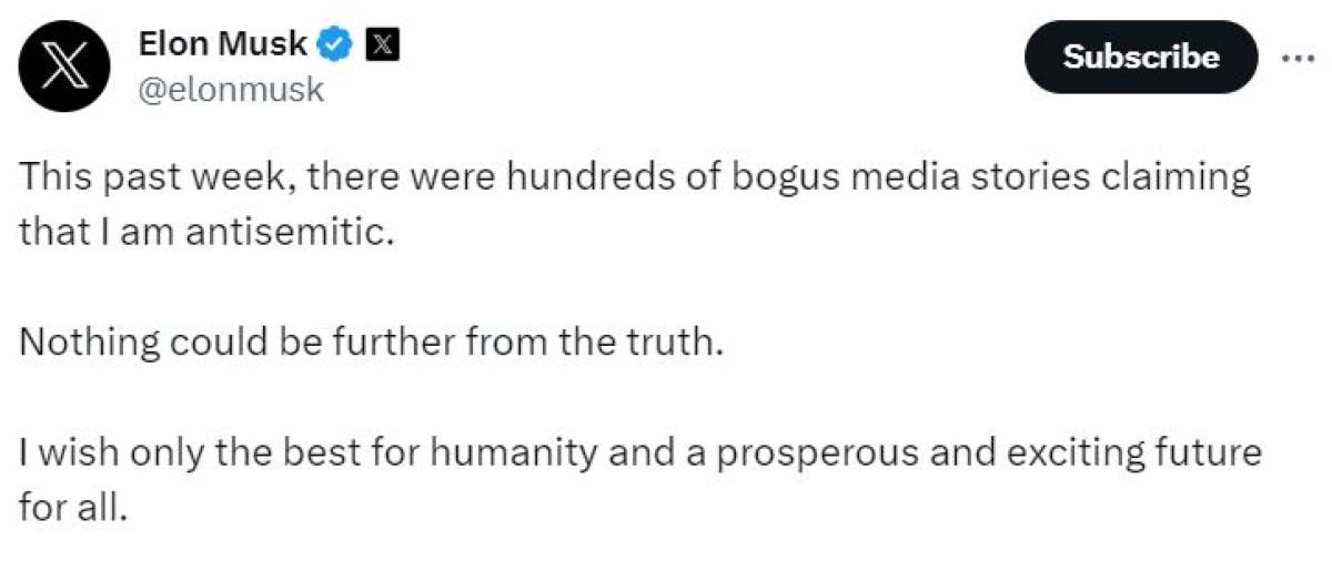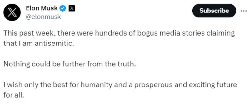 Musk, bir kullanıcının X'te yaptığı, "Yahudiler, insanlardan kendilerine karşı kullanmayı bırakmalarını istedikleri nefreti tam da beyazlara karşı kullanıyor." paylaşımına "Gerçekleri söyledin." yorumunu yapmıştı.