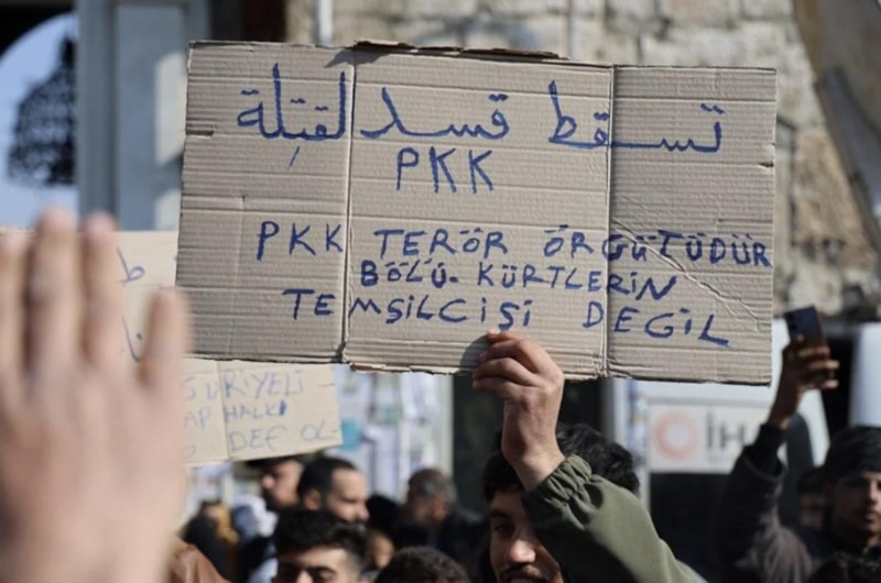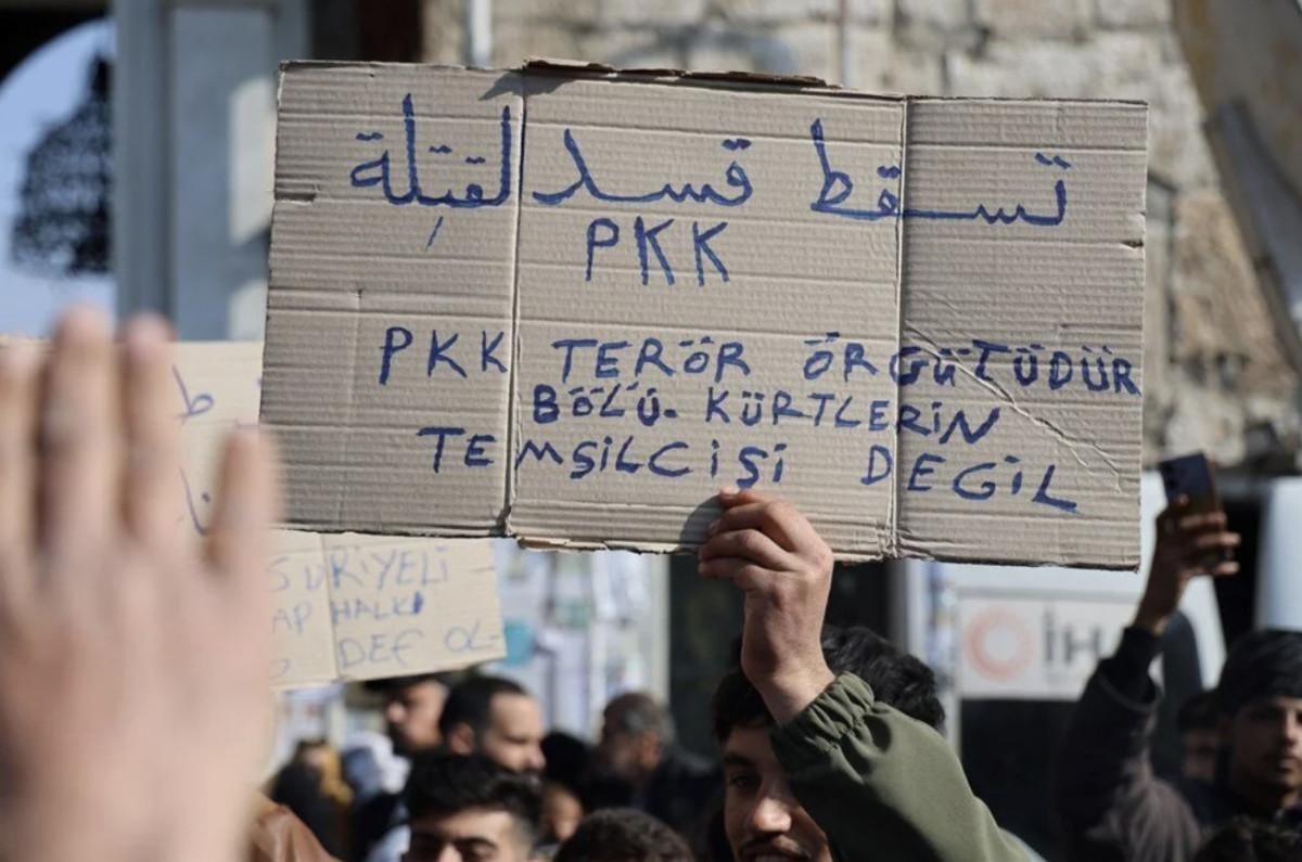 "PKK-YPG terör örgütü bölücüdür. Suriye'yi terk et" yazılı dövizler taşıyan kalabalık, terör karşıtı slogan attı.