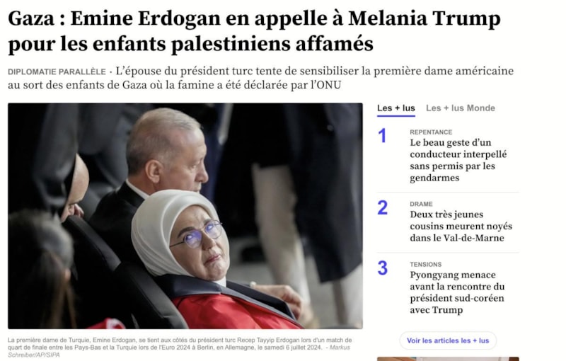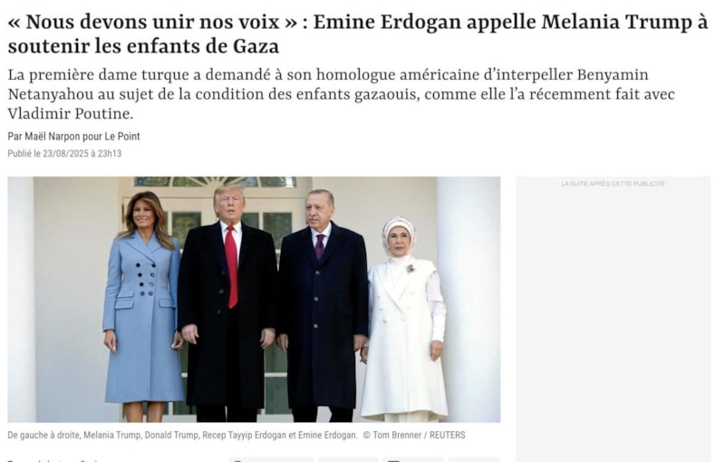 Fransız dergisi Le Point, "Seslerimizi birleştirmeliyiz: Emine Erdoğan Melania Trump’ı Gazze’nin çocuklarını desteklemeye çağırdı" başlığıyla verdiği haberde, Erdoğan'ın, Trump’tan İsrail Başbakanı Binyamin Netanyahu ile Gazze’deki çocukların durumu hakkında görüşmesini istediğini belirtti.