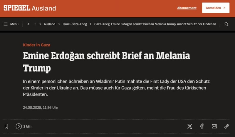 Alman NTV kanalının çevrim içi haber portalı "Erdoğan'ın eşi Melania Trump'a duygusal mektup yazdı" başlığıyla duyurduğu haberde, Erdoğan'ın Trump'a Gazzeli çocuklar için de duyarlılık göstermesi çağrısında bulunduğu belirtildi.