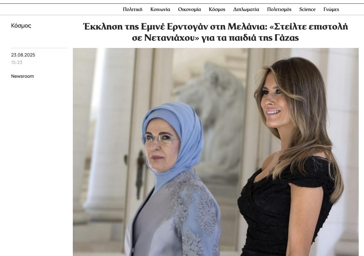 To Vima gazetesi haberi, "Emine Erdoğan’ın Melania’dan isteği" başlığıyla verirken Erdoğan'ın, Trump'tan Ukraynalı çocuklar için gösterdiği hassasiyeti Filistinli çocuklar için de göstermesini istediği vurgulandı.