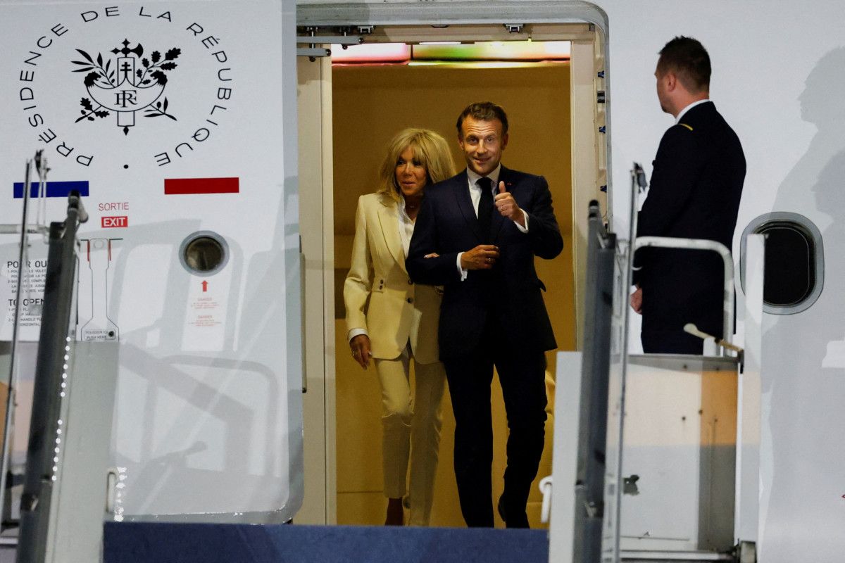Başkent Jakarta'ya inen Macron çifti, tokat dedikodularını gölgelemek için uçaktan kol kola indi.