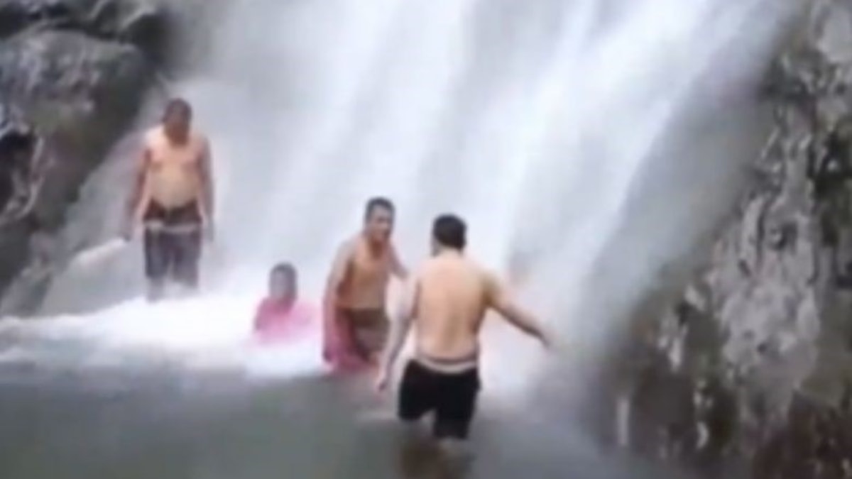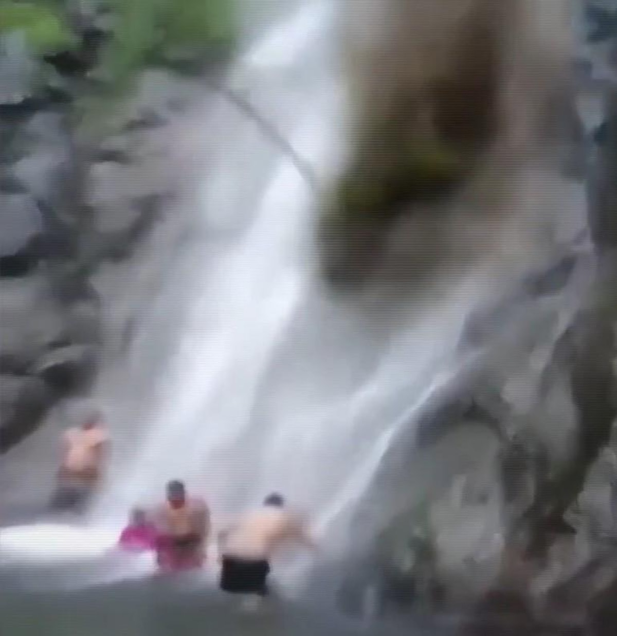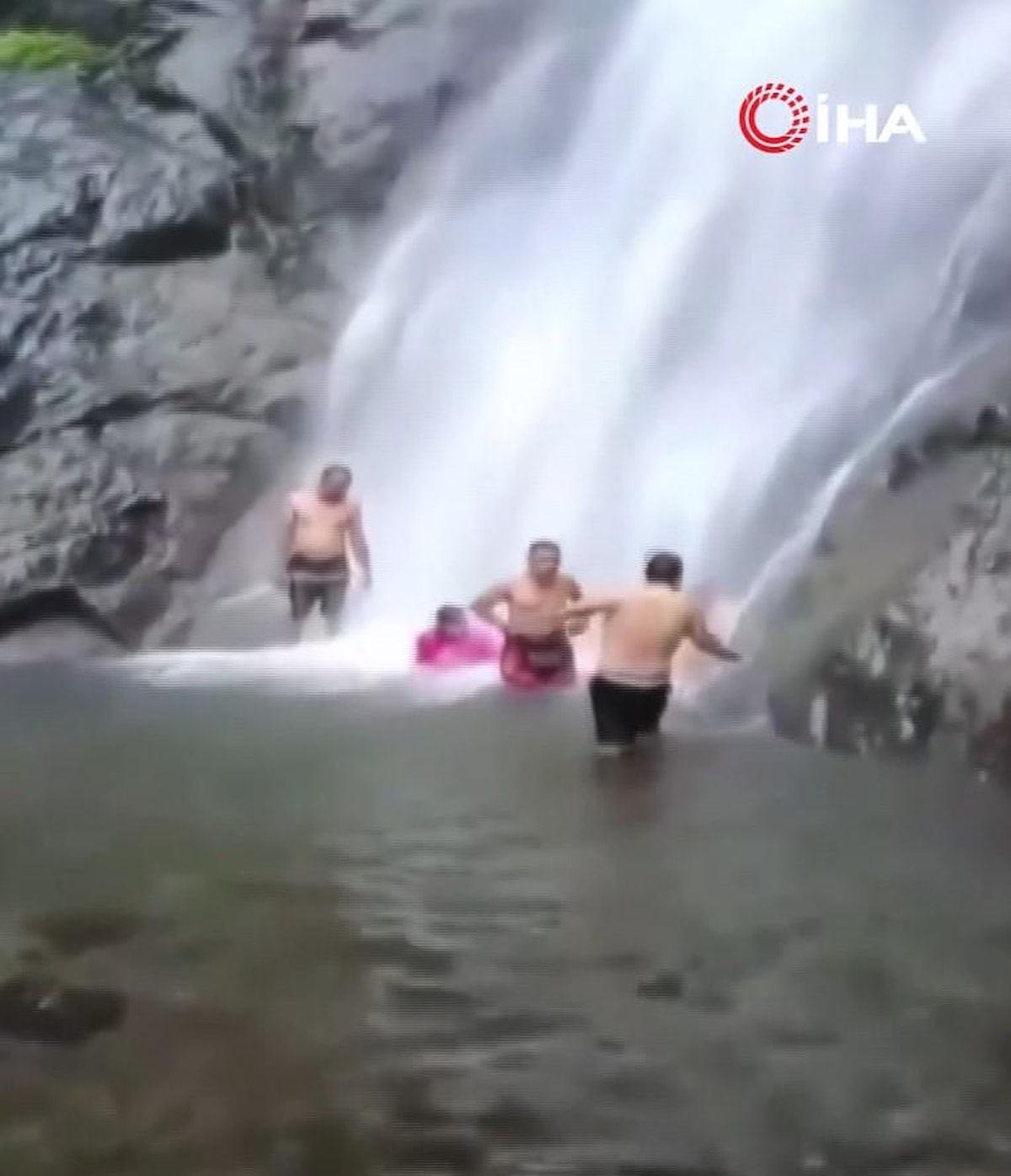 Olay anının kaydedilen görüntülerinde, şelalenin altında suya girdikleri sırada aile üyelerinin üzerine bir anda toprak parçaları ve ağacın düştüğü görüldü.