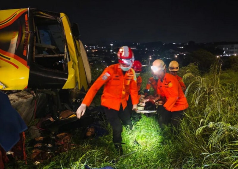 Arama kurtarma yetkilisi Budiono, şehirler arası 34 yolcu taşıyan otobüsün virajlı bir yolda devrildiğini, bazı yolcuların otobüs gövdesiyle bariyer arasında sıkıştığını belirtti.