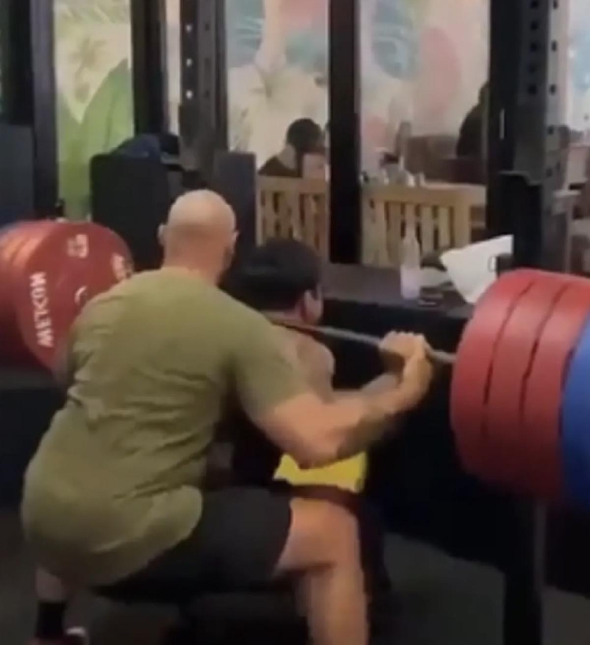 Yardımcı antrenörünün desteğiyle yükün altına giren vücut geliştirme sporcusunun kafası halter çubuğunun altında kaldı.