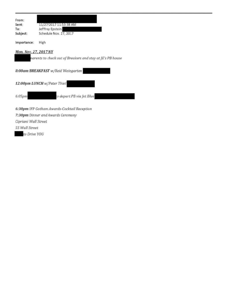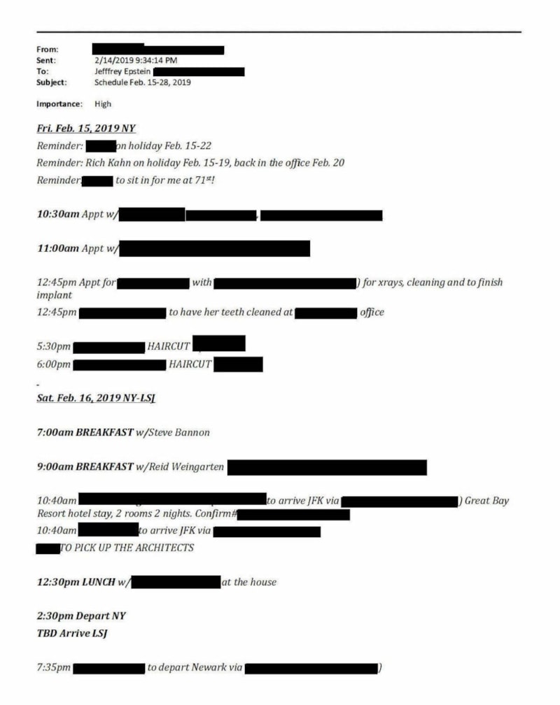 Belgelere göre, Epstein 27 Kasım 2017’de Thiel ile öğle yemeği, 16 Şubat 2019’da ise Bannon ile kahvaltı planladı. Ayrıca Prens Andrew’in isminin, 12 Mayıs 2000’de Epstein ve ortağı Ghislaine Maxwell ile New Jersey’deki Teterboro’dan Florida’daki West Palm Beach’e yapılacak bir uçuşa dair listede yer alması dikkat çekti.