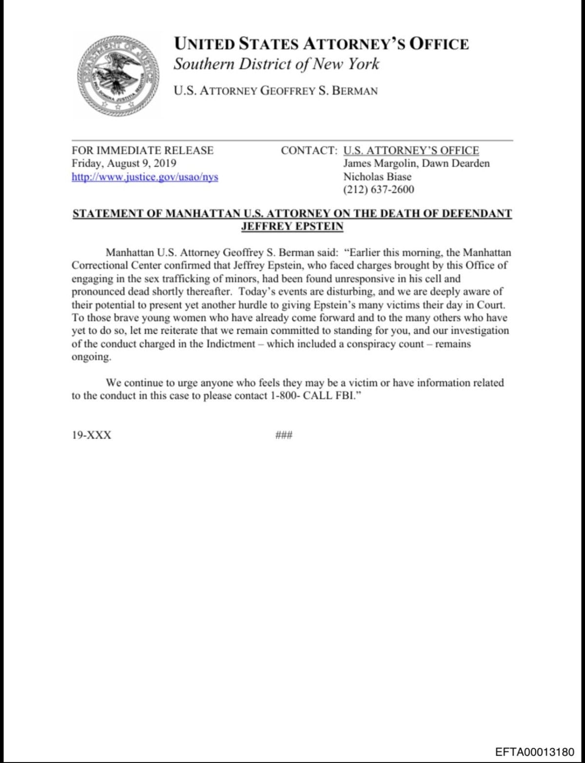 Dosyalarda ayrıca ABD Adalet Bakanlığı tarafından Epstein'in ölümüne dair basın açıklamasının tarihinin 9 Ağustos 2019, yani Epstein'ın açıklanan ölüm tarihinden bir gün öncesine ait olduğu gözlemleniyor.
