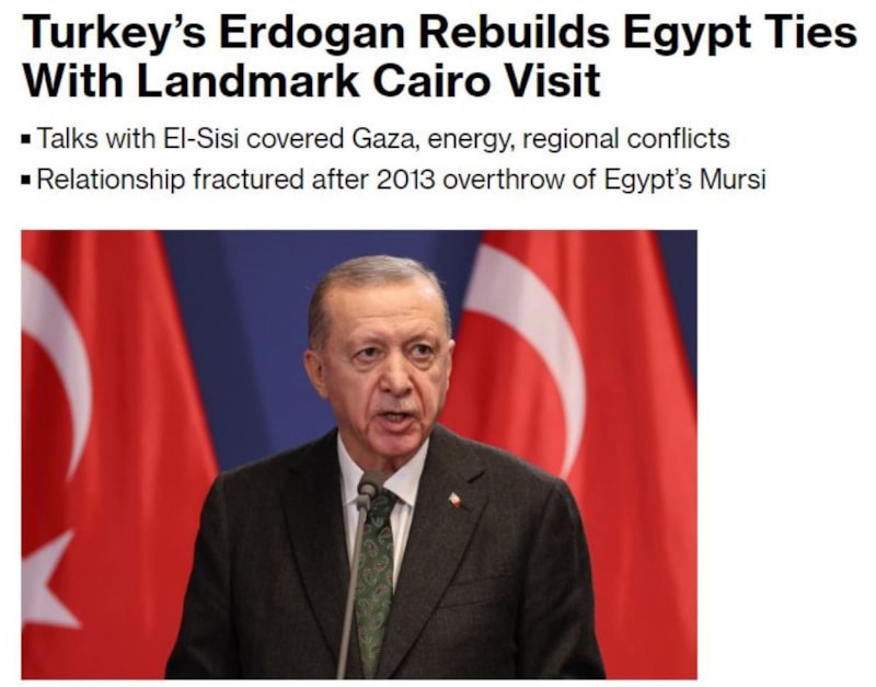Bloomberg, Erdoğan'ın "tarihi Kahire ziyaretiyle Mısır ile ilişkileri yeniden kurduğunu" aktardı.