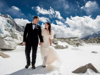 Dünyanın en yüksek dağı olan 8848 metre yükseklikteki Everest'te, evliliğin ilk adımını atan çift, birbirinden güzel düğün fotoğrafları çekildi.
