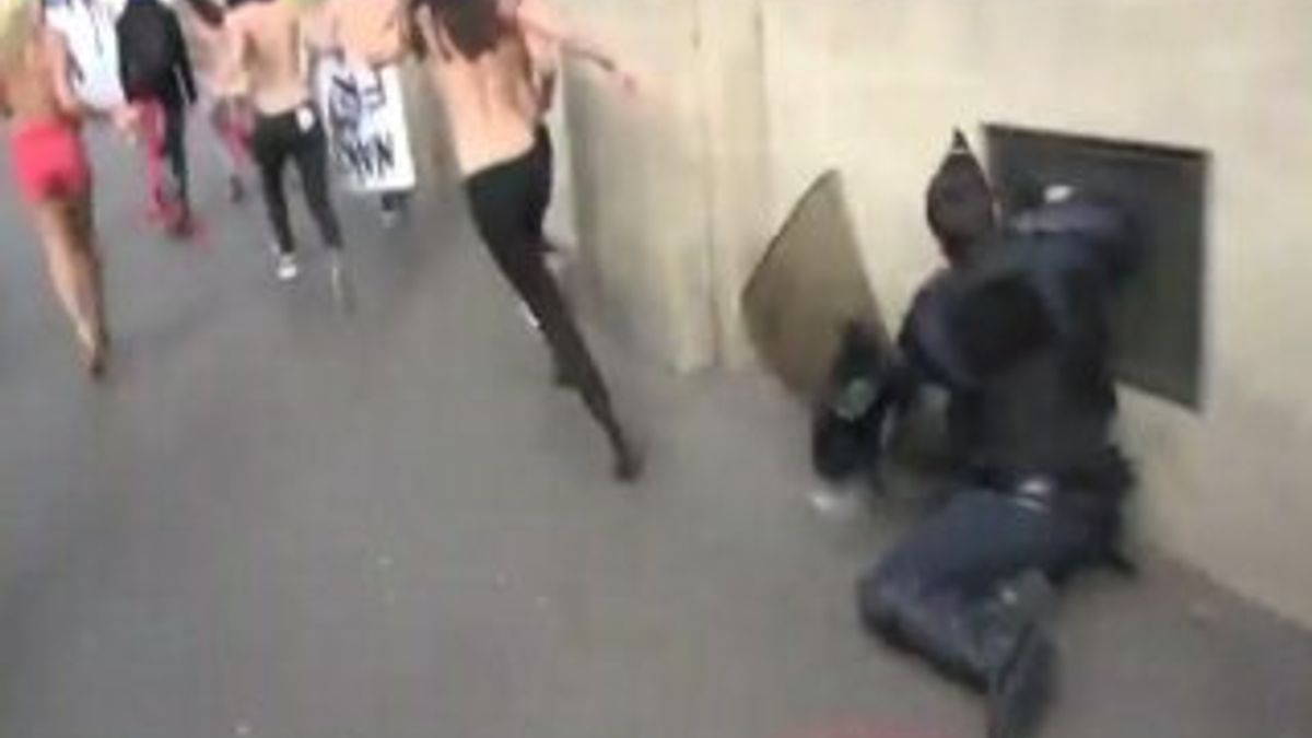 Femen grubunu kovalayan polis duvara tosladı İZLE