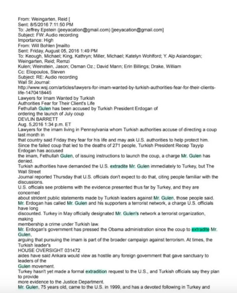 FETÖ elebaşı Fetullah Gülen'in avukatı Reid Weingarten'in, 15 Temmuz darbe girişiminden birkaç gün sonra çocuk istismarı ve fuhuş ağı lideri Jeffrey Epstein'e e-posta göndererek, Gülen için yardım istediği öğrenilmişti.