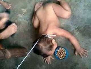 Filipinler'de çekilen fotoğrafta, oğlunu çırılçıplak soyan anne boynuna taktığı tasmayla zavallı bebeğe köpek maması yediriyor.