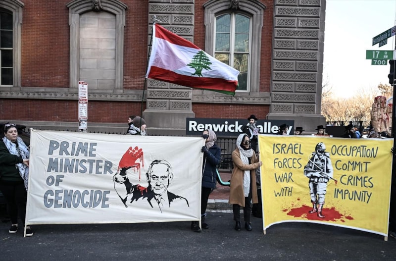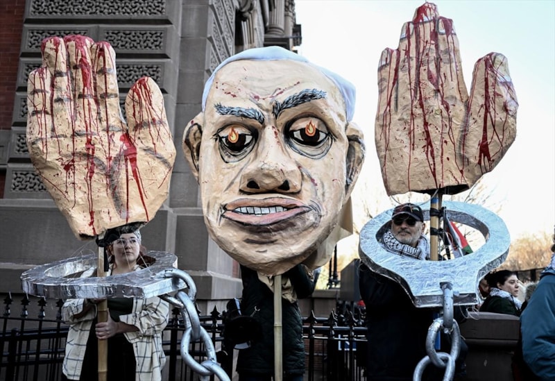 Netanyahu'nun bir "savaş suçlusu" olduğunu vurgulayan göstericiler, “Soykırım Başbakanı”, “Netanyahu savaş suçlusu” ve “İsrail öldürüyor” yazılı pankartlar taşıdı.