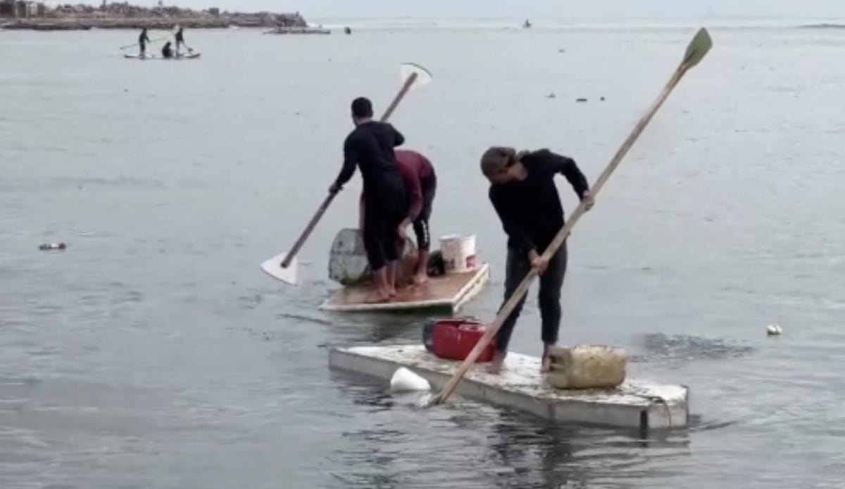 Çoğu zaman eski buzdolabı kapaklarından yapılmış bir tekne ve basit malzemelerle denize açılıyor.