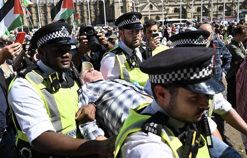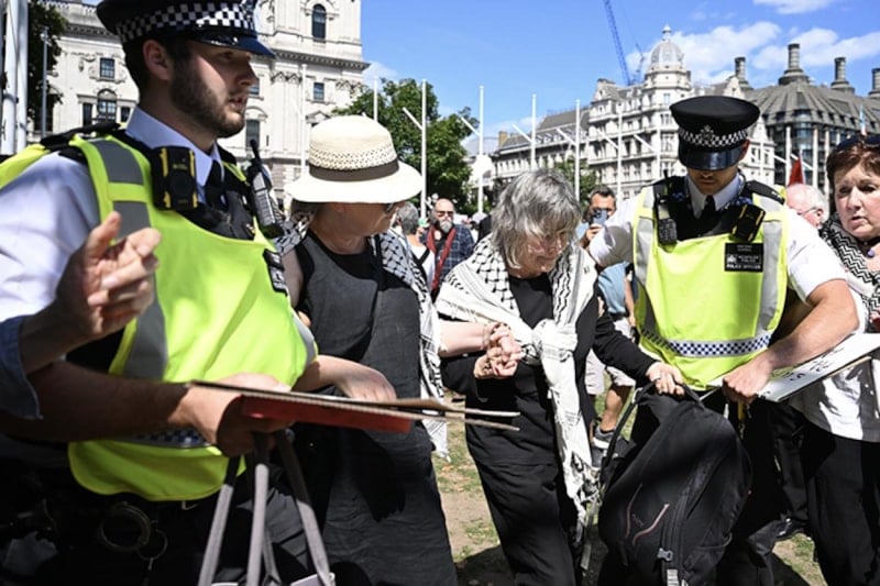 Polis, Palestine Action'ın yasaklı örgütlerden biri olduğunu hatırlatarak eyleme katılan çok sayıda kişiyi gözaltına aldı.