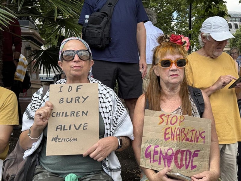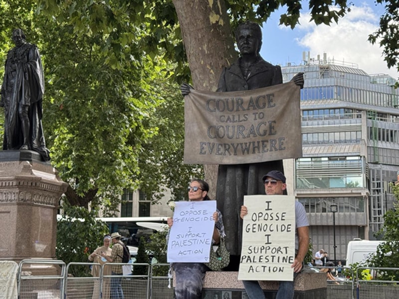 Eylemciler yanlarında boş pankartlar ve kalemler getirerek pankartlarına, "Soykırıma karşıyım, Palestine Action'ı destekliyorum" ifadesini yazdı.