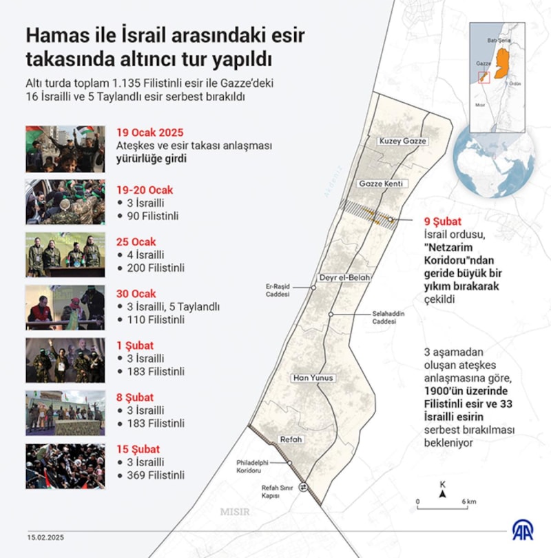 Esir takasının altıncı turunda Hamas'ın Gazze'deki biri ABD-İsrail, biri Rusya-İsrail çifte vatandaşı olmak üzere 3 İsrailli erkek esiri serbest bırakması karşılığında toplam 369 Filistinli esir serbest kaldı.