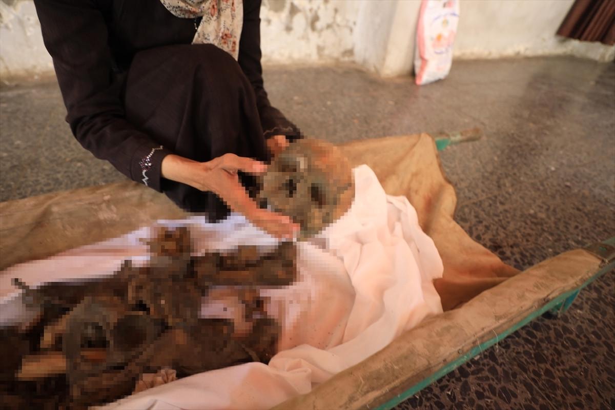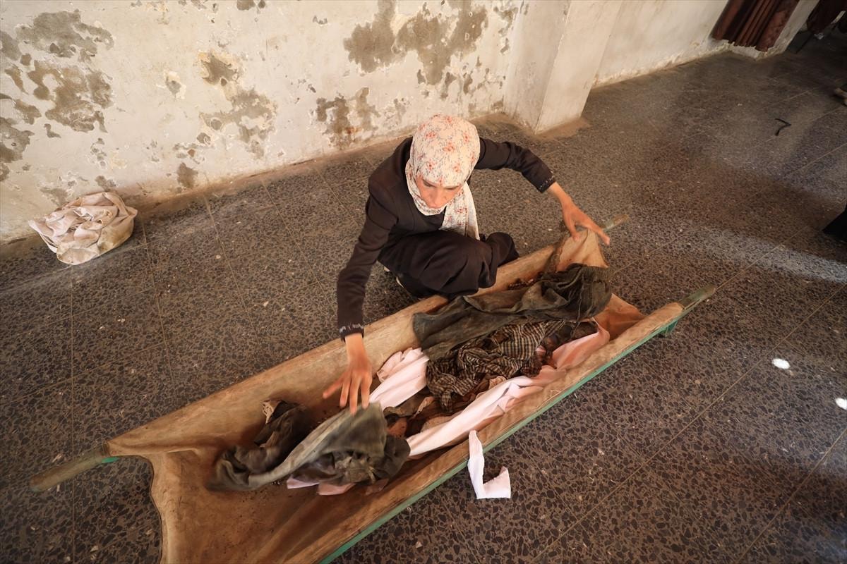 Saldırıdan 44 gün sonra Filistinli kadın, yıkılan evin enkazından babasına ait kafatası ve kemikleri çıkararak Gazze kentindeki el-Ehli Baptist Hastanesi morguna götürdü.