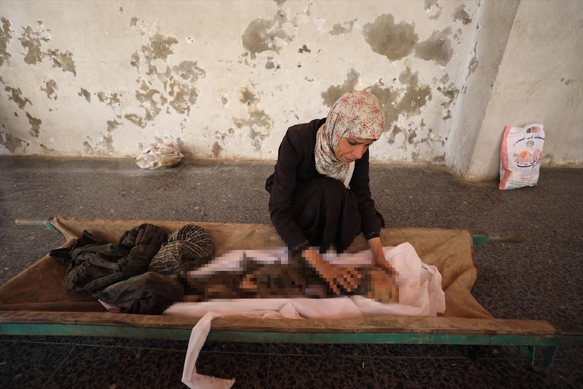 Filistinli kadın, babasının naaşından geriye kalanların başında göz yaşları döktü. Kadın evin enkazı altındaki yakınlarının çıkartılması için çağrıda bulundu.