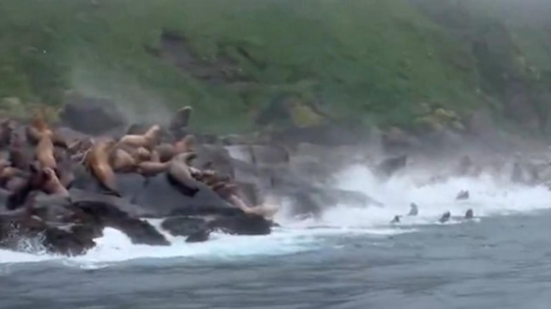 Yerel medya, düşen kayaların ardından fok sürüsünün hızla kıyıdan uzaklaştığı anları yayınladı.