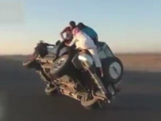 Çılgın Araplar, yolda seyir halindeki aracın tekerleklerini değiştirirken kameraya poz verdi. Görenleri şaşırtan Araplar, yaptıkları lastik değiştirme şovuyla, Formula 1 yarışlarındaki pit stop ekiplerine taş çıkartıyor.