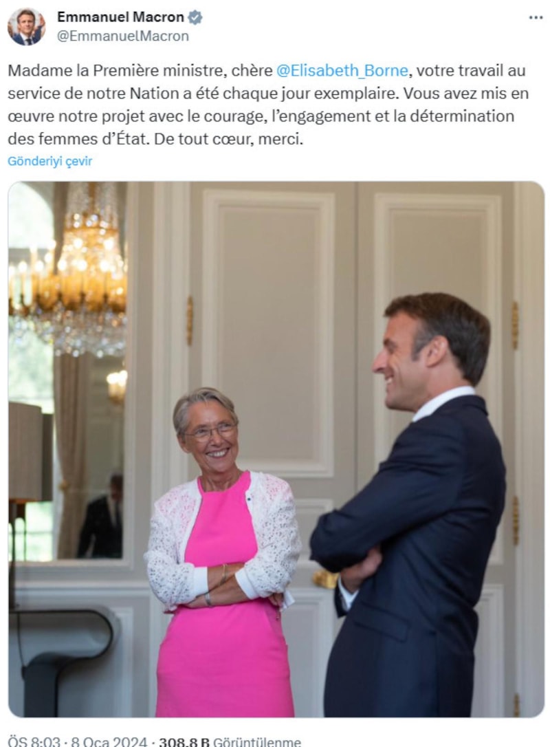 Sosyal medya hesabından açıklama yapan Cumhurbaşkanı Macron, Borne'e teşekkürlerini iletti: