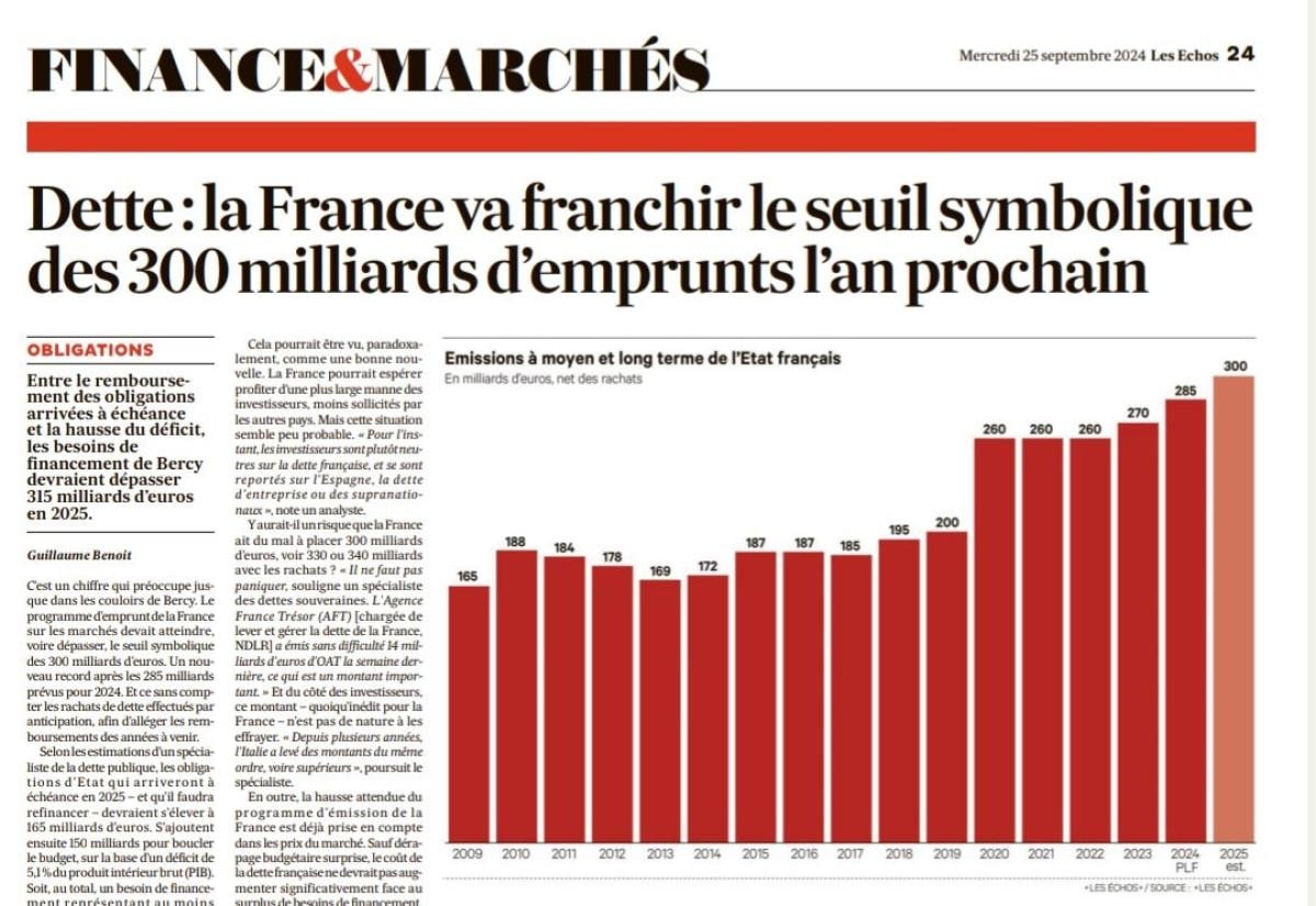 Fransa'da yayınlanan "Finance&Marchés / Finans ve Piyasalar" gazetesine göre, Fransa gelecek yıl kredilerde 300 milyarlık sembolik eşiği aşacak. Vadesi geçen tahvillerin geri ödenmesi ve bütçe açığının artmasıyla kamunun finansman ihtiyacının 2025 yılında 315 milyar euroyu aşması bekleniyor.