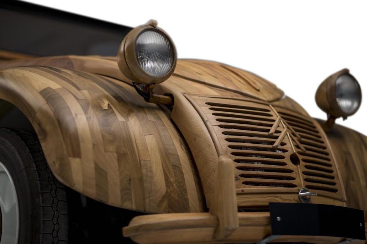 Fransa’da marangoz Michel Robillard tarafından elma, kiraz, ceviz ve armut ağaçları kullanılarak yapılan ahşap otomobil, Tours şehrinde yapılan açık artırmada görücüye çıktı.