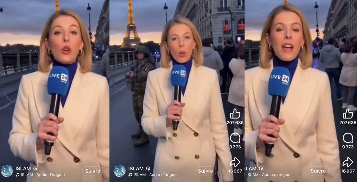 "Live 24" adlı gerçekte var olmayan bir haber kanalının logosuyla paylaşılan videoda, bir muhabir, Eyfel Kulesi önünde polis ışıkları ve helikopter hareketliliği eşliğinde "kimliği belirsiz bir albay önderliğinde darbe yapıldığını" duyuruyordu.
