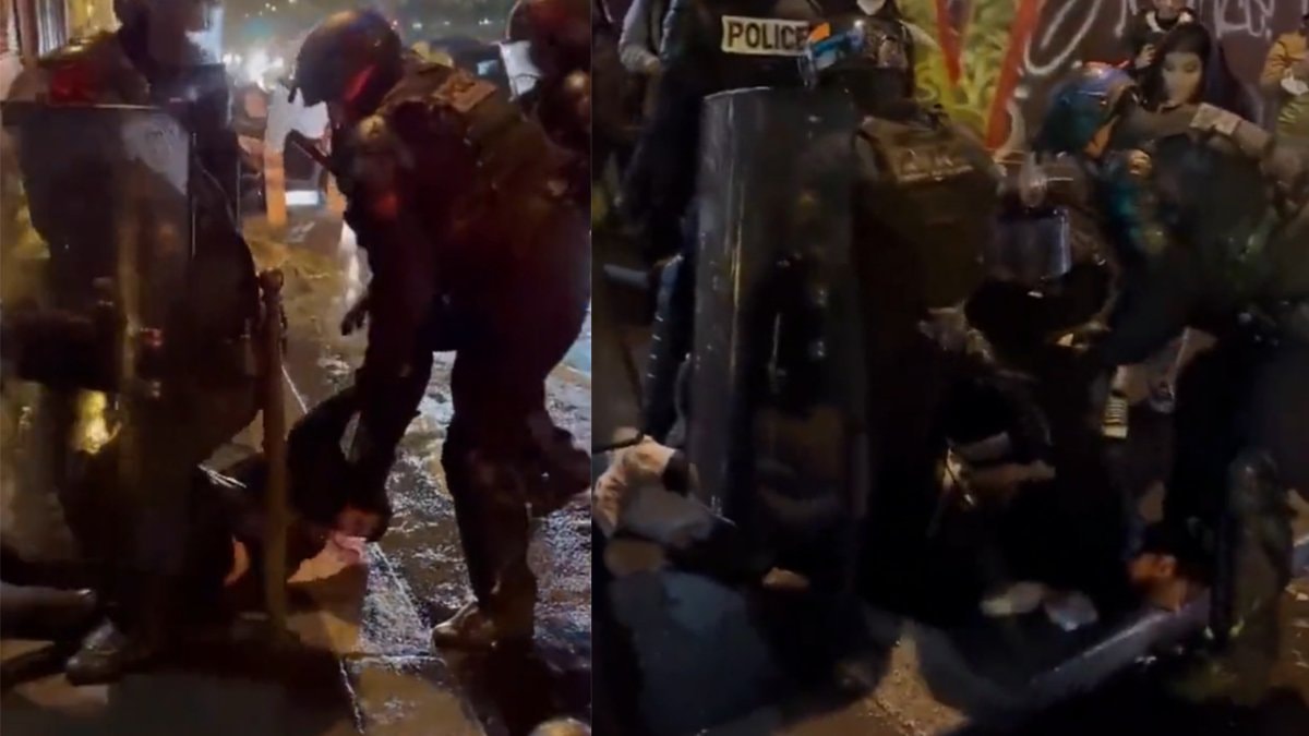 Protestoculara sert müdahalede bulunan Fransız polisi, yere yatırdığı bir kişiyi ayağıyla başını ezerek tutukladı.