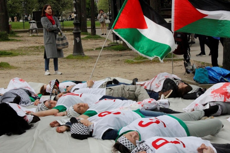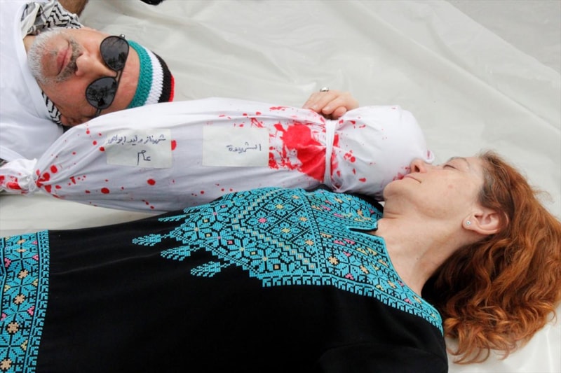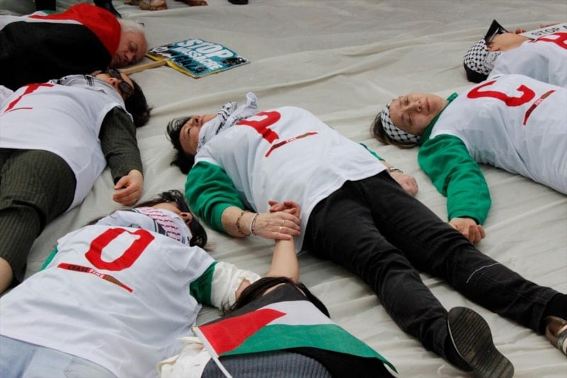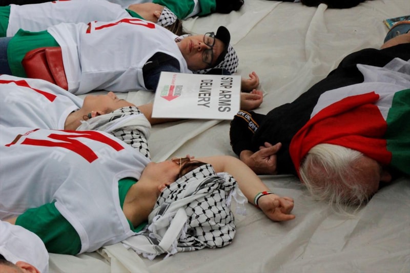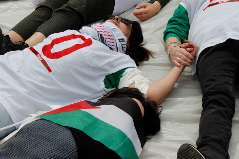 Bazı göstericiler de Gazze'de İsrail'in saldırıları sırasında hayatını kaybeden Filistinlileri temsilen yere uzanarak eylem yaptı.