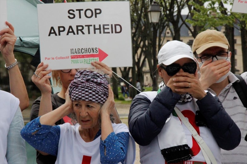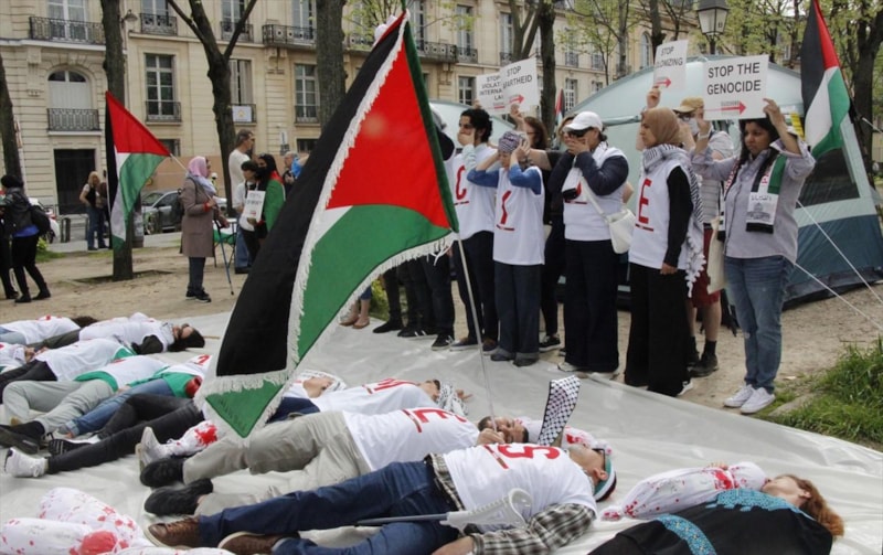 Ellerinde Filistin bayrağının yanı sıra "Apartheid'a Son Verin" ve "Uluslararası Hukuku İhlal Etmeye Son Verin" yazılı pankartlar taşıyan göstericiler, "Soykırımı durdurun", "İsrail katil, Macron (Fransa Cumhurbaşkanı) suç ortağı" ve "Filistin halkının katliamını durdurun" sloganları attı.