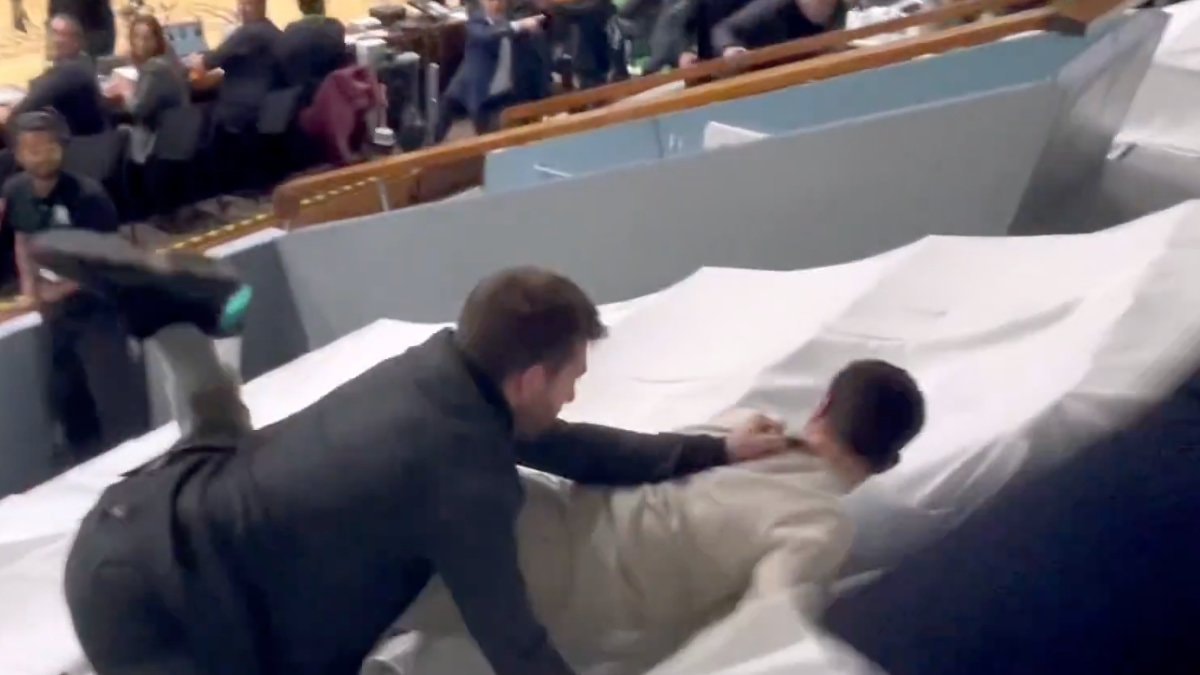 Üzerine gelen güvenliklerden kaçan Filistin destekçisi, kaçmak için İsrailli taraftarların olduğu tribüne çıktı.