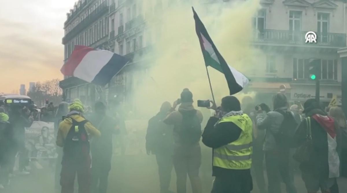 Göstericiler ayrıca Fransa ve Filistin bayrağı ile "(Fransa Cumhurbaşkanı Emmanuel) Macron defol" ve "6. yıl, yorulmadık" yazılı pankartlar taşıyarak, sarı yelekliler hareketinde gelenek haline gelen "Macron istemese de çalışanların onuru ve daha iyi bir dünya için buradayız" sloganıyla seslerini duyurdu.