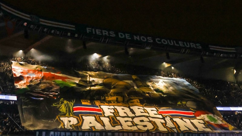 Maç öncesi PSG taraftarı, Filistin'e destek için 'Özgür Filistin' pankartı açtı.