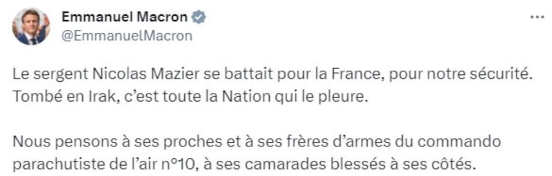 Mazier'nin ailesi ile yakınlarının yanı sıra silah arkadaşlarına başsağlığı dilekleri iletilirken, Irak'ta görev yapan Fransız askerlerinin cesareti, Macron tarafından takdir edildi.