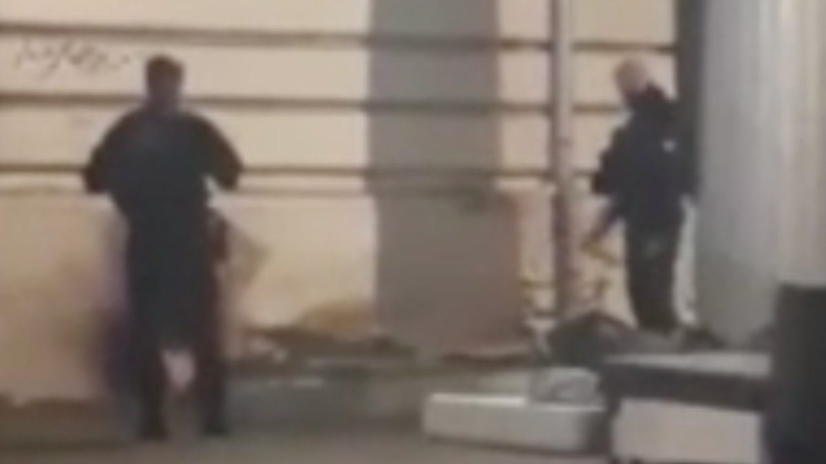 Görüntüde, sığınmacıların kaldığı bir kaldırımdaki duvar dibine giden iki polisten birinin etraftaki battaniye ve kişisel eşyalara gaz sıktığı görülüyor.