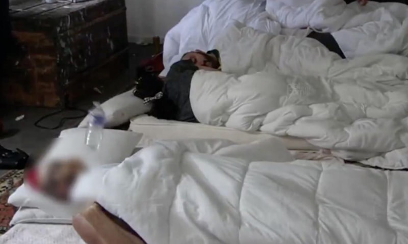Bir arkadaşının, yaşayıp yaşamadığını kontrol etmek için pet şişe fırlattığı anlar da görüntülerde yer aldı.