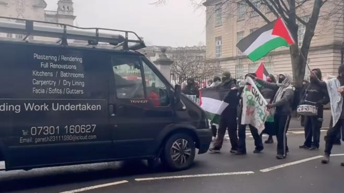 Park Place Caddesi'ndeki eylem sırasında bir şoförün, minibüsünü Filistin destekçisi eylemcilerin üzerine sürmesi görüntülere yansıdı.